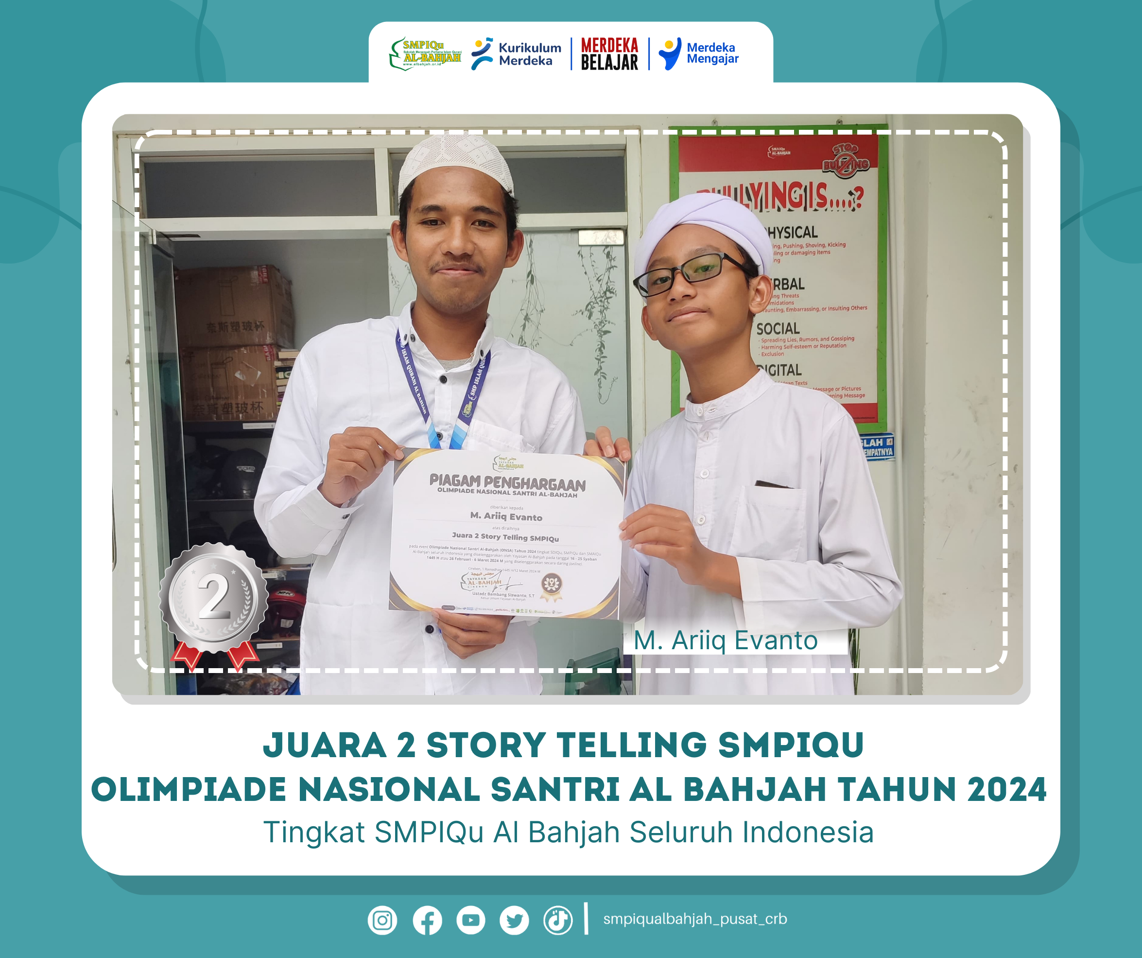 Selamat atas capaian Santri SMPIQu Al Bahjah Pusat meraih juara pada event Olimpiade Nasional Santri Al Bahjah (ONSA) Tahun 2024 tingkat SMPIQu Al Bahjah Seluruh Indonesia yang diselenggarakan oleh Yayasan Al Bahjah pada tanggal 16-25 Sya'ban / 26 Februari - 6 Maret 2024 M secara online.